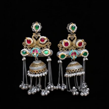 These beautiful tassel earrings from Swadeshi Basket offer a classic oxidized silver look. They are made from brass and feature artificial stones. Each earring is 14.5 cm long and the pair weighs 39 grams, making them feel substantial but comfortable to wear. They come with a secure push back closure. These earrings are made by Hindu owners, keeping tradition alive. You can pick from blue or black stone options to match your style.