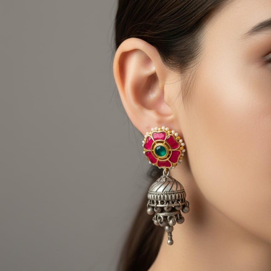 These beautiful earrings blend old style charm with bright colors. They have a striking pink flower design on top. And a classic oxidized jhumka hangs below.