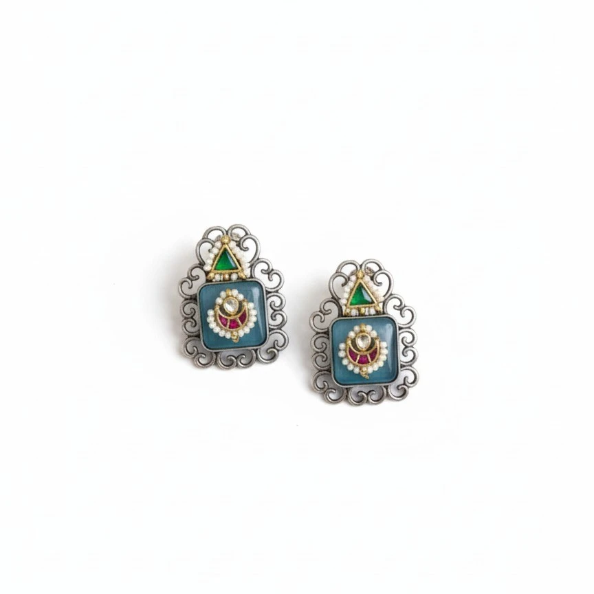 The earrings have a unique design. They are square shaped with a detailed frame around the edge. In the middle, a beautiful Monalisha stone is surrounded by small pearls and red accents. You can choose between a skyblue stone or a black stone to match your style.