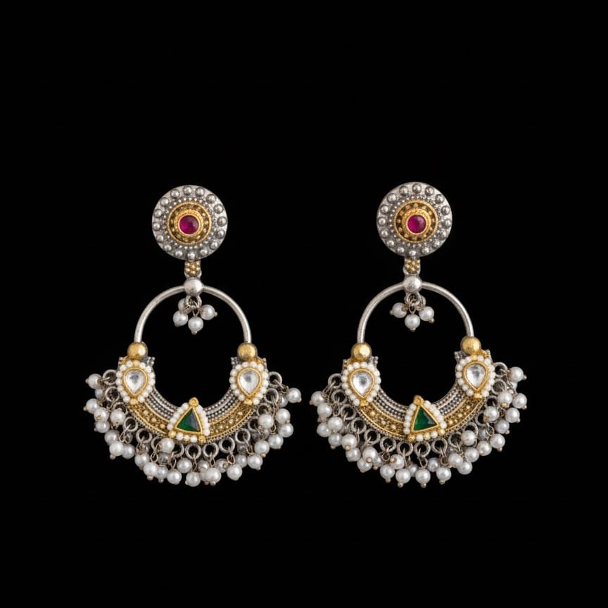 This pair of Chandbali earrings offers a classic style. They combine silver and gold colored alloy metals. The earrings show off real pearls and colorful stones. They are a perfect match for traditional Indian wear.