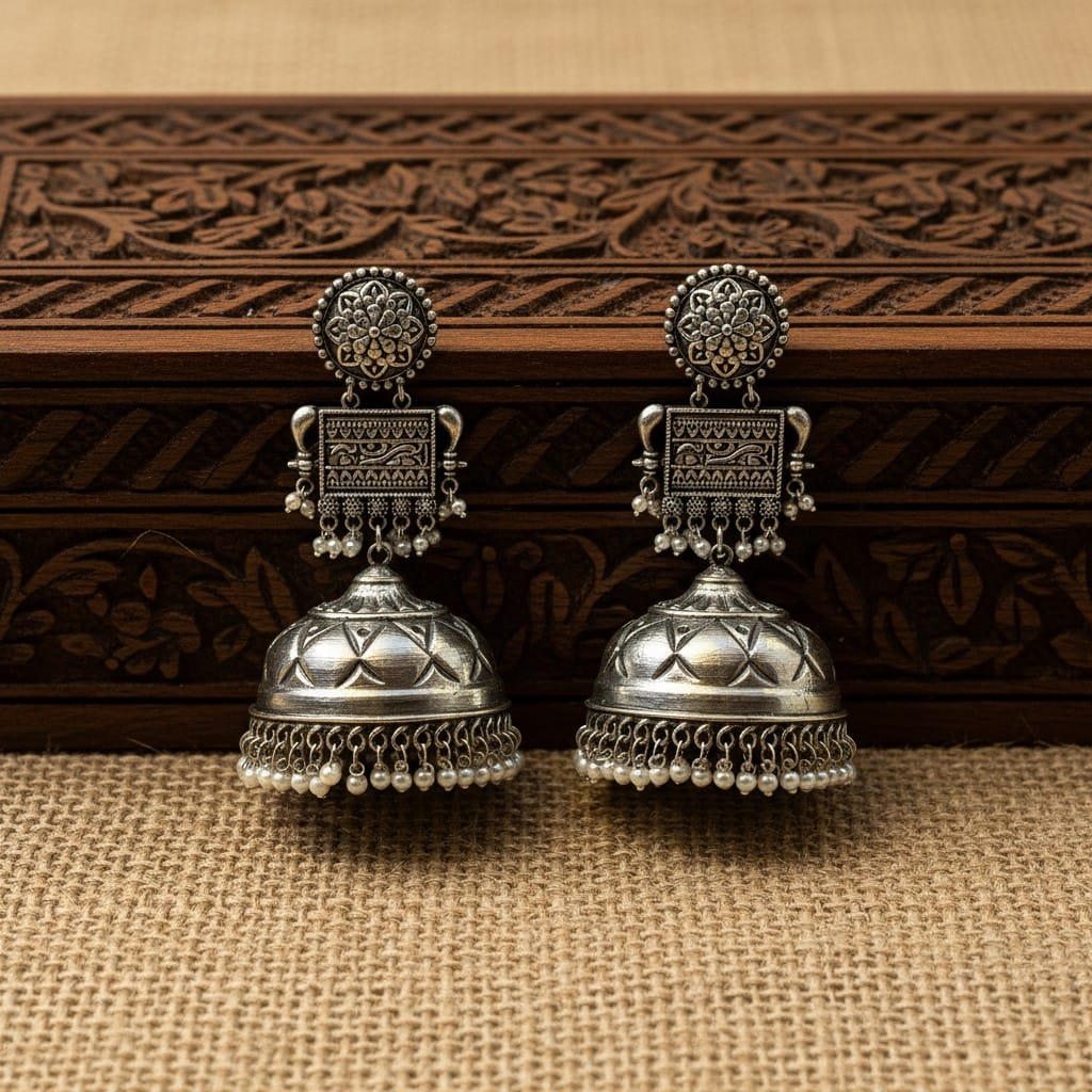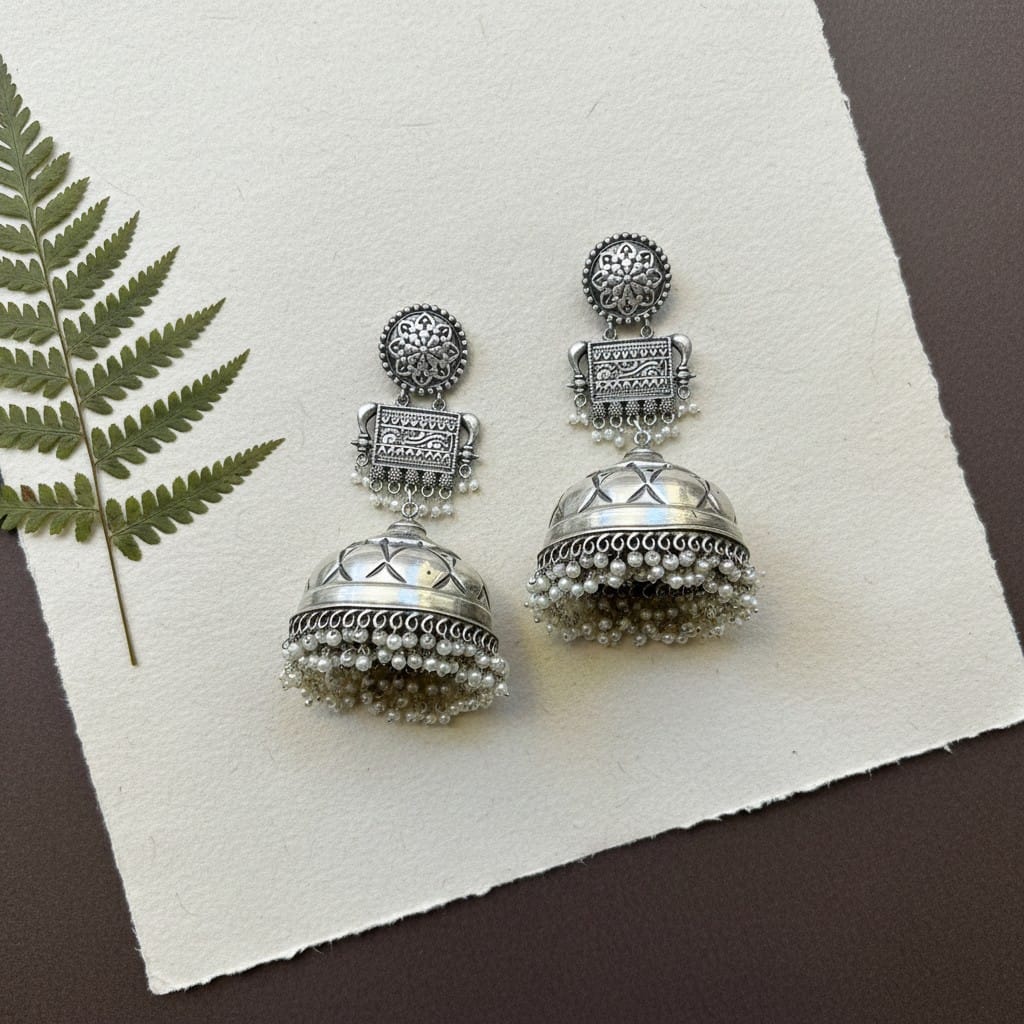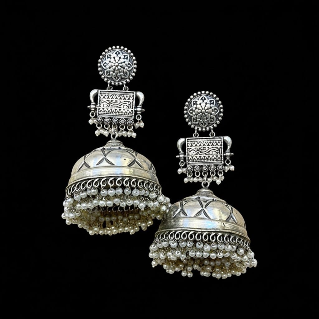 - These are large jhumka earrings that have a classic oxidized silver look.
